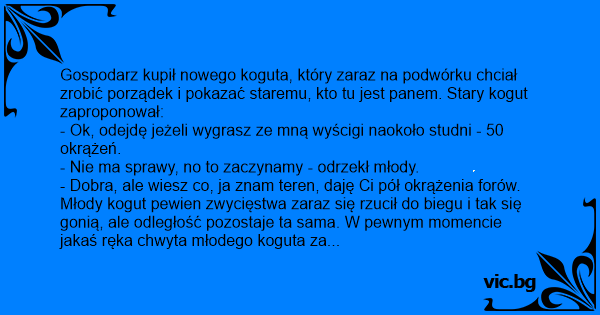Петел Τα δύο κοκόρια... В курника идва нов петел и казва на стария: Un galletto è arrivato nel pollaio per affiancare e prendere il posto del vecchio gallo. - 'Domani mattina' - dice il galletto 'dormi pure tranquillo, che alle galline ci penso io!' - 'Senti' - risponde l'anziano e navigato gallo - 'sii gentile e lasciami almeno quelle più vecchie, sai siamo... Der Hahn: Ein Bauer braucht einen neuen Zuchthahn. Er sucht sich aus dem Katalog einen ausgezeichneten Champion aus und bestellt ihn. Als der Hahn dann auf der Farm angekommen und aus seiner Box raus ist, flitzt er geradewegs zu den Hennen ins Gehege und nimmt sich eine nach der anderen vor.... Петелът на един стопанин бил вече стар и затова човекът отишъл на пазара и си купил младо петле. Пуснал го в кокошарника и доволен отишъл да си налее една ракия. В това време до петлето се приближил накокошинен стария петел: - Слушай младеж, заради едни кокошки - с теб няма да се бия! Бягаме пет... Un paysan a acheté un tout nouveau coq, trouvant le sien trop vieux pour satisfaire toutes ses poules. Alors quand le jeune coq arrive dans la basse-cour, le vieux coq vient le trouver et lui dit :... In einem Hühnerhof. Der Hahn ist schon alt, daher beschließt der Bauer einen jungen Hahn zu holen, der für Küken sorgen soll. Der junge Hahn wird in das Gehege gesetzt. Der alte Hahn geht auf ihn... I hopp om att få lite ny fart i hönsgården hade man skaffat sig en ny ung tupp på gården. Den gamle tuppen granskade nyfiket nykomlingen en stund och föreslog sedan: - Ska vi springa i kapp runt... O fazendeiro resolve trocar o seu galo por outro que desse conta das inúmeras galinhas. Ao chegar o novo galo e, percebendo que perderia suas funções, o velho galo foi conversar com seu substituto:... Een boer had een nieuwe haan gekocht. De oude haan gaat direct naar de nieuwe en zegt: "ik ben blij dat g'er zijt, maar zoudt ge ook nog een paar kippen voor mij over willen laten?" Waarop de jonge... Um fazendeiro compra um galo novo e solta ele no terreiro. Rapidamente o galo novo rouba todas as galinhas do galo velho. Então o galo velho propos um acordo. Galo velho: MEU JOVEM VAMOS... Der var kommet en ny og yngre hane til hønsegården... Den gamle hane sagde lige ud: Denne hønsegård er for lille til os begge, lad os afgøre det ved et kapløb - den der hurtigst løber ti gange... Na fazenda do seu Joaquim precisavam de um novo galo pois o que tinham já nao fazia mais nada,entao Joaquim compra um novo galo. Mas no galinheiro o outro galo nao se conforma com tudo isso,entao... Llega un gallo joven a un gallinero, mira en su entorno hasta localizar al gallo viejo, se dirige hacia él y le dice: - Bien amigo, tu hora de retiro ha llegado: ahora yo estoy al mando. - Pero... Kanalaan oli ostettu nuori kukko ja vanha kukko oli siitä hieman kimpaantunut, koska uusihan vei sen kaikki kanat. Hän ehdotti uudelle kukolle kilpailua. Juostaan kanala kolme kertaa ympäri ja... Er was is een boer die had een haan en die steeds ouder werd. De boer kocht steeds een jonge haan. Maar die verdween steeds. Op een dag kwam die weer met een jonge haan. De haan kwam binnen, stak... En un gallinero con cien gallinas convive un gallo viejo. El patrón de la quinta compra un gallo joven que no hace migas con el gallo viejo. El gallo viejo pide al gallo joven que le deje dos... Un granjero decide que ya es hora de renovar la sangre de su gallinero,de manera que, aunque el viejo gallo todavía trabaja, está un poco entrado en años y piensa que obtener un nuevo gallo a nadie... Az öreg farmer elhatározza, hogy itt az ideje, hogy vegyen már egy új kakast a tyúkjainak, hogy jobban tojjanak. Meg is vesz egy fiatal büszke léptű jószágot, és szabadon ereszti a baromfiudvarban.... Некој фармер купил млад убав петел за да го замени веќе стариот и изморен петел и да си го обнови кокошарникот. Кога го пуштил во дворот, младиов петел му приоѓа на стариот и му вика: - Добро...