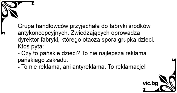 Grupa handlowców przyjechała do fabryki środków antykoncepcyjnych. Zwiedzających oprowadza dyrektor fabryki, którego otacza spora grupka dzieci. Ktoś pyta: