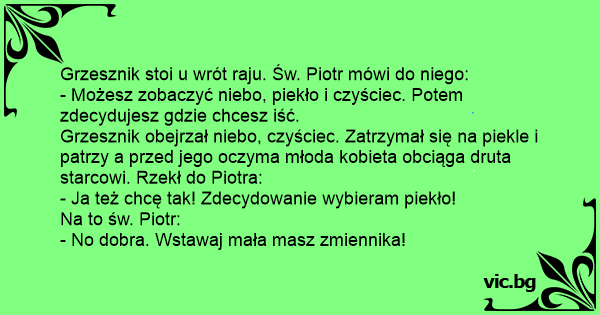 Grzesznik obejrzał niebo, czyściec. Zatrzymał się na piekle i patrzy a przed jego oczyma młoda kobieta obciąga druta starcowi. Rzekł do Piotra: