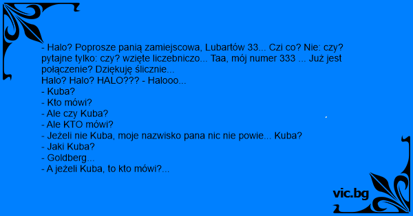 - Halo? Poprosze panią zamiejscowa, Lubartów 33... Czi co? Nie: czy? pytajne tylko: czy? wzięte liczebniczo... Taa, mój numer 333 ... Już jest połączenie? Dziękuję ślicznie...