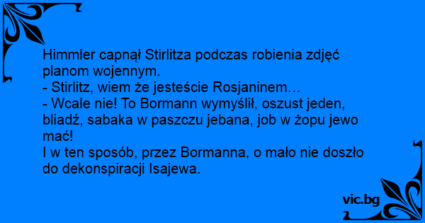 - Wcale nie! To Bormann wymyślił, oszust jeden, bliadź, sabaka w paszczu jebana, job w żopu jewo mać!