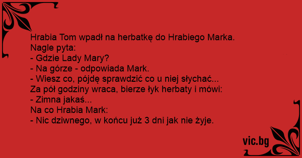 Za pół godziny wraca, bierze łyk herbaty i mówi: