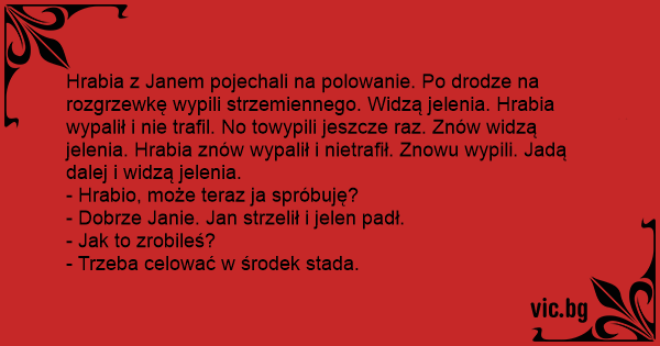 Hrabia z Janem pojechali na polowanie. Po drodze na rozgrzewkę wypili strzemiennego. Widzą jelenia. Hrabia wypalił i nie trafil. No towypili jeszcze raz. Znów widzą jelenia. Hrabia znów wypalił i nietrafił. Znowu wypili. Jadą dalej i widzą jelenia.