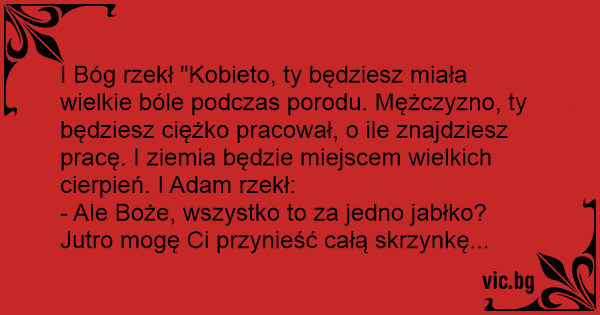 I Bóg rzekł "Kobieto, ty będziesz miała wielkie bóle podczas porodu. Mężczyzno, ty będziesz ciężko pracował, o ile znajdziesz pracę. I ziemia będzie miejscem wielkich cierpień. I Adam rzekł: