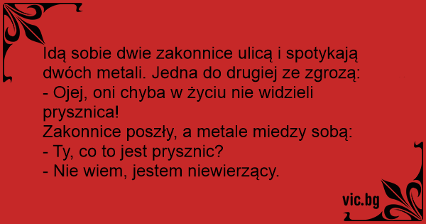 Idą sobie dwie zakonnice ulicą i spotykają dwóch metali. Jedna do drugiej ze zgrozą: