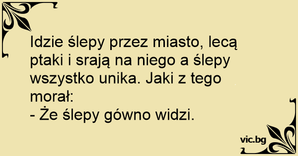 Idzie ślepy przez miasto, lecą ptaki i srają na niego a ślepy wszystko unika. Jaki z tego morał: