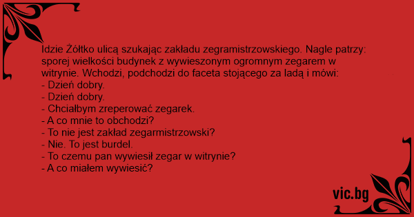 Idzie Żółtko ulicą szukając zakładu zegramistrzowskiego. Nagle patrzy: sporej wielkości budynek z wywieszonym ogromnym zegarem w witrynie. Wchodzi, podchodzi do faceta stojącego za ladą i mówi: