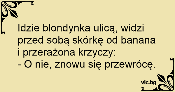 Jde blondýnka po ulici a uvidí před sebou banánovou slupku. „Ach jo,” povzdechne si. „Zase upadnu!”