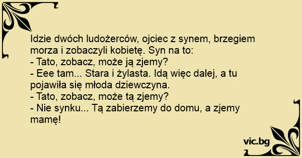 Idzie dwóch ludożerców, ojciec z synem, brzegiem morza i zobaczyli kobietę. Syn na to: