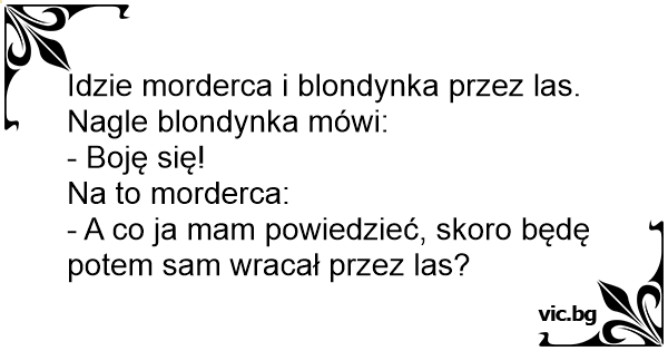 Seryjny morderca ciągnie kobietę do lasu. Kobieta krzyczy przerażona: - Ale ponuro i ciemno w tym lesie. Bardzo się boję! Na to morderca: - No, a ja co mam powiedzieć? Będę wracał sam...