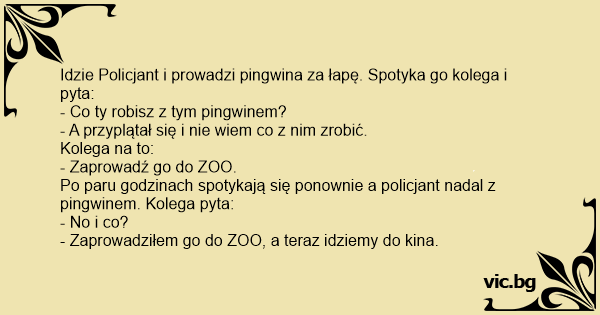 Мајмун Chiste del pingüino y el policia Η ξανθιά και ο πιγκουίνος Един господин намира папагал на улицата. Двама борци намират пингвин. - Bonjour, avez-vous amené au zoo le pingouin que vous avez trouvé dans la rue? Две мутри намират пингвин и звънят на шефа: Kommt ein Mann mit einem gefundenen Schimpansen an der Hand in ein Polizeirevier und will ihn abgeben. Ein Mann ging über die Straße und sah einen Pinguin. Daraufhin ging er zu einem Polizisten und sagte ihm: "Ich habe 'n Pinguin auf der Straße gefunden." Der Polizist antwortete daraufhin: "Bringen Sie Ihn in den Zoo." Der Mann ging am nächsten Tag mit dem Pinguin in den Zoo. Dort traf er den... A man has his car full of penguins. He drives past a policeman, but the policeman stops him. He says: "Hey, you! Yeah, you! You should take those penguins to the zoo!" The man does that. The next day in the same spot, the man still has the penguins. Once again he drives past the policeman.... Ήταν μια ξανθιά και στον δρόμο της είδε έναν παπαγάλο και σκεφτόταν τι να τον κάνει. Έρχεται ένας αστυνόμος και την ρωτάει: -Γιατί είστε εδώ όλη μέρα; -Βρήκα αυτόν τον παπαγάλο και δεν ξέρω τι να τον κάνω. -Να τον πάτε στο ζωολογικό κήπο. -Τέλεια ιδέα! Την επόμενη μέρα ο αστυνόμος βλέπει παλι τον... Μια ξανθιά πάει στο πάρκο και βρίσκει έναν παπαγάλο. Tι να τον κάνω η γυναίκα; (Σκέφτεται. Ίσως για πρώτη φορά στη ζωή της). Εκεί που βασάνιζε το `μυαλό` της, ένας αστυνομικός που περιπολούσε εκεί κοντά, την πλησιάζει και τη ρωτάει: - "Τι συμβαίνει εδώ;" - "Βρήκα έναν παπαγάλο και δεν ξέρω τι... Un carabiniere trova un pinguino per la strada per cui telefona in centrale per chiedere cosa farne. "Portalo allo zoo". Il giorno dopo ritelefona e chiede: "E oggi dove lo porto, al cinema?". A police officer sees a man driving around with a pickup truck full of penguins. He pulls the guy over and says: “You can’t drive around with penguins in this town! Take them to the zoo... En äldre dam hittade en pingvin. Hon visste inte vad hon skulle göra med den, så när hon träffade en polis frågade hon: - Vad ska jag göra av den här pingvinen? - Gå till djurparken med den,... 2 Agenten komen een pinguin tegen op straat. "Wat moeten we daarmee?" zeggen ze tegen elkaar... Ze beslissen uiteindelijk om hem mee te nemen. Onderweg gaan ze tanken en de pompbediende vraagt hen:... Un type se promène avec un crocodile dans Paris. Un policier l'interpelle: - Dites donc vous là, que faites-vous avec ce crocodile ? - Hé bien, je l'ai trouvé et je ne sais pas quoi en faire. -... Un carabiniere ferma un uomo che passeggia per la città con una giraffa e gli ordina di portarla immediatamente allo zoo. Il giorno dopo lo stesso carabiniere incontra di nuovo il signore con la... Um homem encontra um pinguim e não sabe o que fazer. Um amigo aconselha: — Leve o bicho ao zoológico. No dia seguinte o amigo encontra o homem ainda com o pinguim: — Ué! Você não levou o bicho para... Policjant widzi kolegę, który idzie z pingwinem. - Skąd wytrzasnąłeś tego ptaka? - A przyplątał się, i nie wiem co z nim zrobić. - Jak to co? Idź z nim do zoo. Po kilku godzinach znowu widzi kolegę... Do skrzyżowania podjeżdża kabriolet, w którym siedzi kierowca i 4 pingwiny. Podchodzi policjant i mówi: - Te pingwiny powinien pan zawieźć do zoo. Na drugi dzień sytuacja się powtarza. Policjant... A man was driving down the road with twenty penguins in the back seat. The police stop him and say that he can’t drive around with the penguins in the car and should take them to the zoo. The man... Geht ein Mann mit seinem Pinguin in der Stadt spazieren. Dort kommt ihm eine Frau entgegen und sagt:„Oh mit dem Pinguin müssen sie aber mal in den Zoo!“ Der Mann antwortete:„Okay ich weiß zwar... Adamın birisi pek güzel bir penguen bulmuş. Bu pengueni çok sevmiş. Onunla birlikte yürürken bir polisle karşılaşmış. Polise sormuş: - Bu pengueni n'apayım? Polis ona: - Hayvanat bahçesine götür,... A rendőr talál egy pingvint a városban. Kérdezi a főnőkét, mit csináljon vele. - Hát vidd el az állatkertbe! Elmegy a rendőr. Délután találkozik a főnökével, de még mindig mellette a pingvin. Kérdi... En politimann møtte en svenske med en pingvin i bånd. - Ta den med til dyreparken med en gang! sa han. - Javel! svarte svensken. Neste dag møtte politimannen svensken og pingvinen igjen. - Sa jeg... En man var ute och gick sin vanliga promenad vid vattnet. Då hittade han en pingvin och eftersom han inte visste vad han skulle göra gick han med pingvinen till polisen och frågade: - Vad ska jag... Een man vindt een pinguin op de straat. Hij gaat naar de politiebureau met de pinguin. "Ik heb een pinguin gevonden:Wat moet ik ermee doen?" vraagt hij. "U moet hem meenemen naar de dierentuin"... En mand kommer kørende i sin bil med en pingvin på bagsædet. Da de når ind til byen, bliver de stoppet af en betjent som beder manden om at rulle ruden ned. "Hvad laver du med en pingvin på...