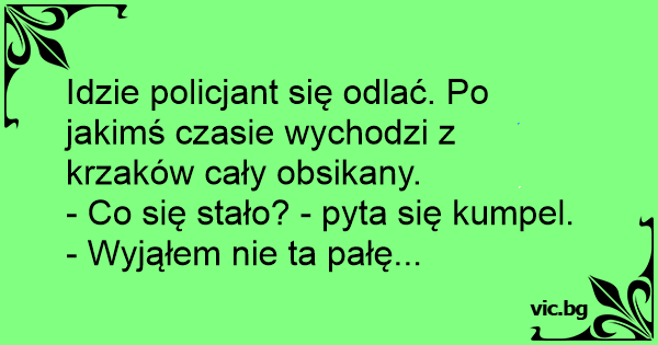 Idzie policjant się odlać. Po jakimś czasie wychodzi z krzaków cały obsikany.