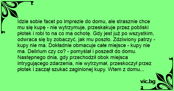 Idzie sobie facet po imprezie do domu, ale strasznie chce mu się kupę - nie wytrzymuje, przeskakuje przez pobliski płotek i robi to na co ma ochotę. Gdy jest już po wszystkim, odwraca się by zobaczyć, jak mu poszło. Zdziwiony patrzy - kupy nie ma. Dokładnie obmacuje całe miejsce - kupy nie ma. Delirium czy co? - pomyślał i poszedł do domu. Następnego dnia, gdy przechodził obok miejsca intrygującego zdarzenia, nie wytrzymał, przeskoczył przez płotek i zaczął szukać zaginionej kupy. Wtem z domu wychodzi właściciel: