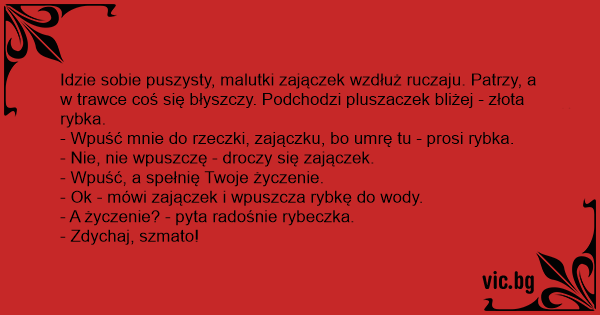 - Wpuść mnie do rzeczki, zajączku, bo umrę tu - prosi rybka.