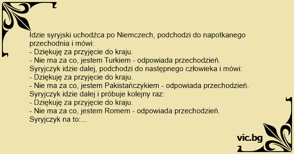 Idzie syryjski uchodźca po Niemczech, podchodzi do napotkanego przechodnia i mówi: