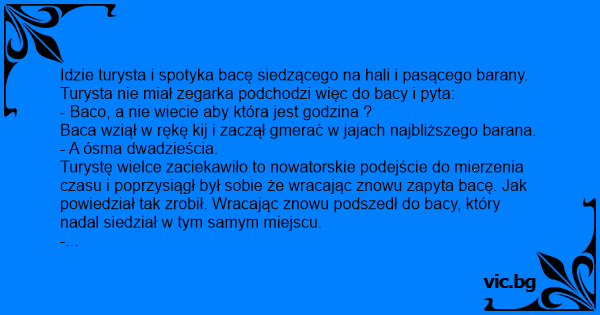 Idzie turysta i spotyka bacę siedzącego na hali i pasącego barany. Turysta nie miał zegarka podchodzi więc do bacy i pyta: