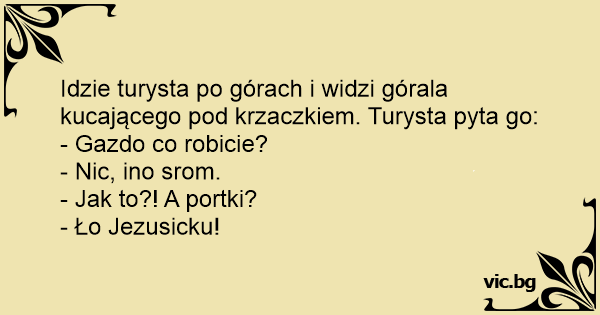 Idzie turysta po górach i widzi górala kucającego pod krzaczkiem. Turysta pyta go: