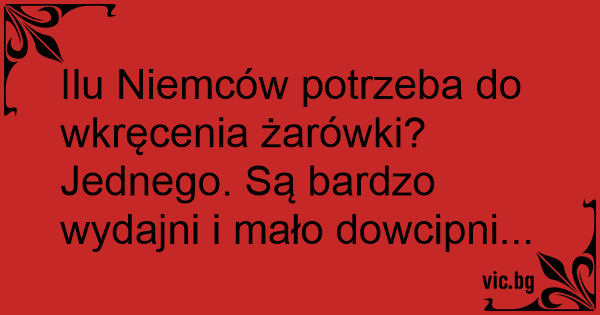 Ilu Niemców potrzeba do wkręcenia żarówki?Jednego. Są bardzo wydajni i mało dowcipni... 0 0 0 Dowcipy o Polaku, Niemcu i innych