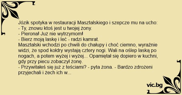 Masztalski wchodzi po chwili do chałupy i choć ciemno, wyraźnie widzi, że spod kołdry wystają cztery nogi. Wali na oślep laską po nogach, a potem wyżej i wyżej... Opamiętał się dopiero w kuchni, gdy przy piecu zobaczył żonę.