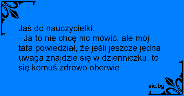 - Ja to nie chcę nic mówić, ale mój tata powiedział, że jeśli jeszcze jedna uwaga znajdzie się w dzienniczku, to się komuś zdrowo oberwie.