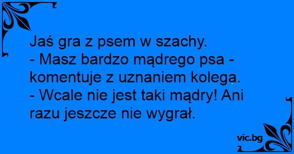 En mann besøkte sin venn og så forskrekket at vennen spilte sjakk med hunden sin. Han så på en stund, før han utbrøt: - ”Det er den smarteste hunden jeg har sett!” - ”Næh, han er ikke så smart”,...