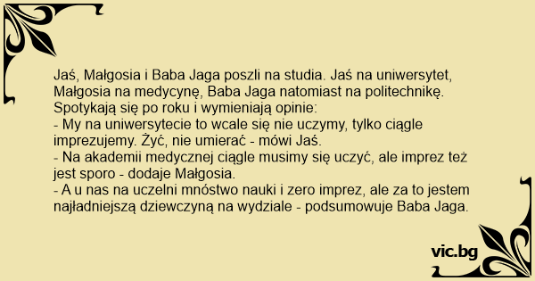 Jaś, Małgosia i Baba Jaga poszli na studia. Jaś na uniwersytet, Małgosia na medycynę, Baba Jaga natomiast na politechnikę. Spotykają się po roku i wymieniają opinie: