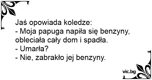 - Moja papuga napiła się benzyny, obleciała cały dom i spadła.