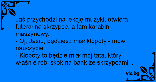 - Kłopoty to będzie miał mój tata, który właśnie robi skok na bank ze skrzypcami...