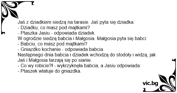 - Co wy robicie?! - wykrzyknęła babcia, a Jasiu odpowiada:
