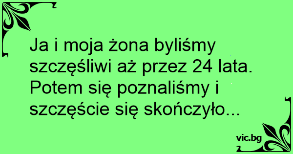 - I tjugo år, sa mannen i baren vemodigt, var min fru och jag fullkomligt lyckliga. - Vad hände sen? frågade bartendern. - Vi träffades.