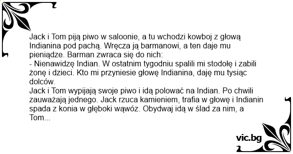 Jack i Tom piją piwo w saloonie, a tu wchodzi kowboj z głową Indianina pod pachą. Wręcza ją barmanowi, a ten daje mu pieniądze. Barman zwraca się do nich: