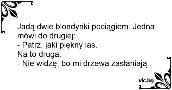 Važiuoja blondinė su brunetė už vairo ir sako: - Blondine, tu pasisžiūrėk, kokie gražūs Lietuvos miškai. Blondine atsako: - Nematau, medžiai užstoja..