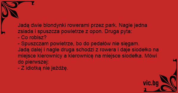 Jadą dwie blondynki rowerami przez park. Nagle jedna zsiada i spuszcza powietrze z opon. Druga pyta: