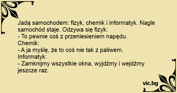 Jadą samochodem: fizyk, chemik i informatyk. Nagle samochód staje. Odzywa się fizyk: