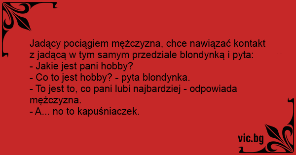 Jadący pociągiem mężczyzna, chce nawiązać kontakt z jadącą w tym samym przedziale blondynką i pyta: