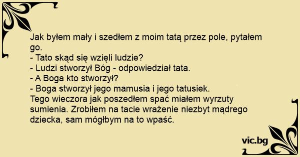 Tego wieczora jak poszedłem spać miałem wyrzuty sumienia. Zrobiłem na tacie wrażenie niezbyt mądrego dziecka, sam mógłbym na to wpaść.