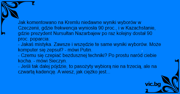 - Jakaś mistyka. Zawsze i wszędzie te same wyniki wyborów. Może komputer się zepsuł? - mówi Putin.