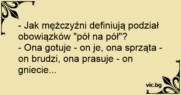 - Ona gotuje - on je, ona sprząta - on brudzi, ona prasuje - on gniecie...