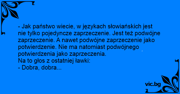 - Jak państwo wiecie, w językach słowiańskich jest nie tylko pojedyncze zaprzeczenie. Jest też podwójne zaprzeczenie. A nawet podwójne zaprzeczenie jako potwierdzenie. Nie ma natomiast podwójnego potwierdzenia jako zaprzeczenia.