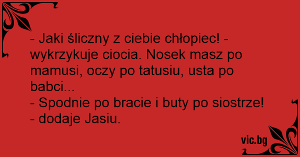 - Jaki śliczny z ciebie chłopiec! - wykrzykuje ciocia. Nosek masz po mamusi, oczy po tatusiu, usta po babci...