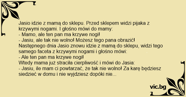 Jasio idzie z mamą do sklepu. Przed sklepem widzi pijaka z krzywymi nogami. I głośno mówi do mamy: