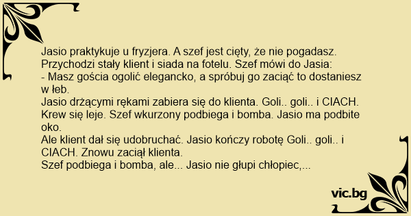 Jasio praktykuje u fryzjera. A szef jest cięty, że nie pogadasz. Przychodzi stały klient i siada na fotelu. Szef mówi do Jasia: