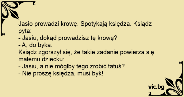 Jasio przychodzi po dwudniowej nieobecności w szkole a pani pyta: - Jasiu dlaczego wczoraj nie byłeś w szkole? - Musiałem prowadzić krowę do byka! - A nie mógł tego zrobić ojciec? - Nie proszę...