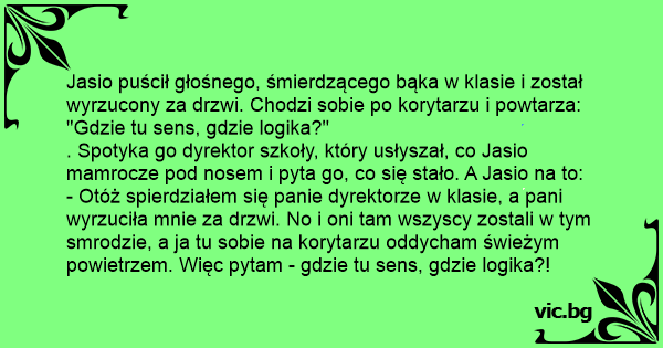 - Otóż spierdziałem się panie dyrektorze w klasie, a pani wyrzuciła mnie za drzwi. No i oni tam wszyscy zostali w tym smrodzie, a ja tu sobie na korytarzu oddycham świeżym powietrzem. Więc pytam - gdzie tu sens, gdzie logika?!