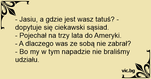- Jasiu, a gdzie jest wasz tatuś? - dopytuje się ciekawski sąsiad.
