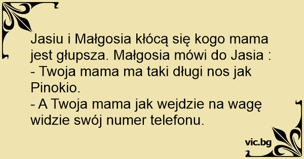 Jasiu i Małgosia kłócą się kogo mama jest głupsza. Małgosia mówi do Jasia :