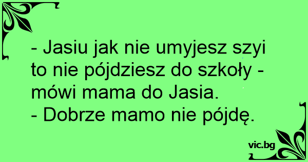 - Jasiu jak nie umyjesz szyi to nie pójdziesz do szkoły - mówi mama do Jasia.
