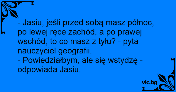 - Jasiu, jeśli przed sobą masz północ, po lewej ręce zachód, a po prawej wschód, to co masz z tyłu? - pyta nauczyciel geografii.