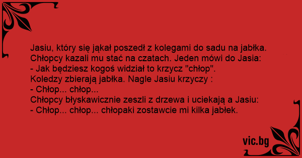 Jasiu, który się jąkał poszedł z kolegami do sadu na jabłka. Chłopcy kazali mu stać na czatach. Jeden mówi do Jasia: