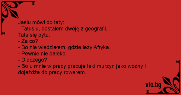 Apu, egyest kaptam az iskolában, mert nem tudtam, hol van Afrika. Te tudod? - Én sem tudom kisfiam, menj, kérdezd meg anyádat! - Anyu, hol van Afrika? - Nem tudom, de nem lehet túl messze! Dolgozik...